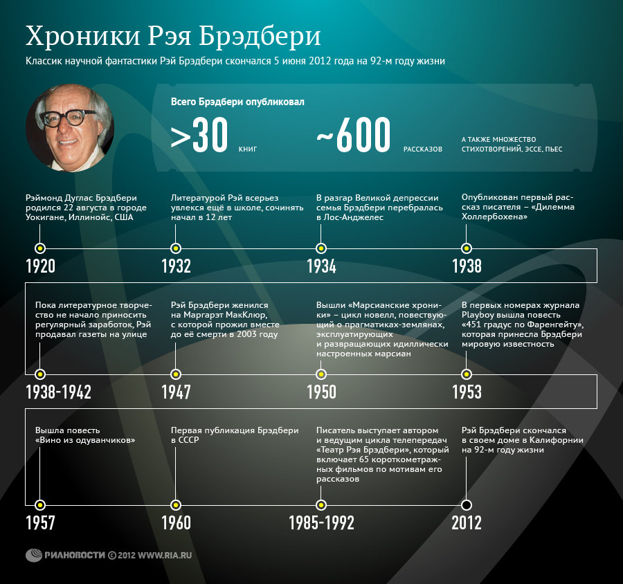 Рэй Брэдбери прожил чуть больше 90 лет. Умер он в ночь с 5 на 6 июня 2012 года у себя дома.
