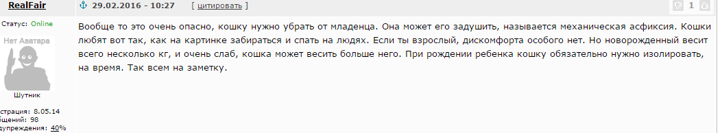 Я выше писал сообщение, о том что еще пару недель назад в одной из тем предупреждал об опасности кошек для младенцев. Вы думаете я это сам придумал? Меня этому на судебной медицине учили в институте юстиции, когда разбирали детскую смертность и возможные заключения судмедэкспертов, и в органах я 10 лет отработал в криминалке. Очки снимите розовые, кошка это конечно милое животное, но только тогда когда ты больше ее, в противном случае она опасна, пусть даже если и не хочет причинить вред.