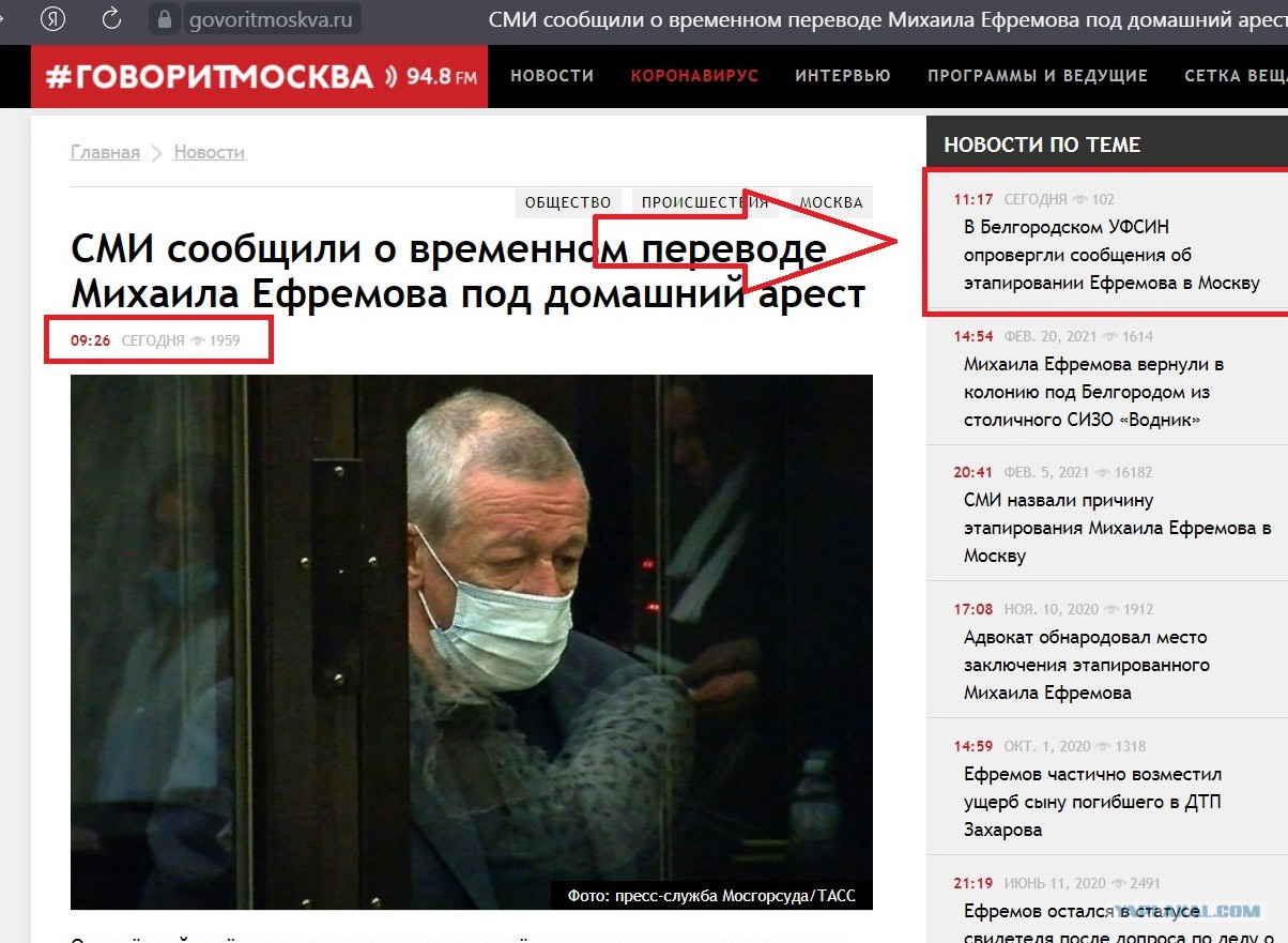 "Данная информация не соответствует действительности. Осужденный Ефремов М.О. в настоящее время отбывает наказание в том же исправительном учреждении в Белгородской области", - сообщает пресс-служба ведомства.