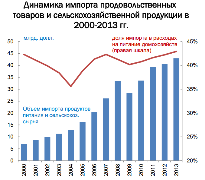 "Согласно данным ВТО в 2012 году Россия импортировала продукты питания на сумму $39 млрд, что составляет 3% от мирового рынка продовольствия".