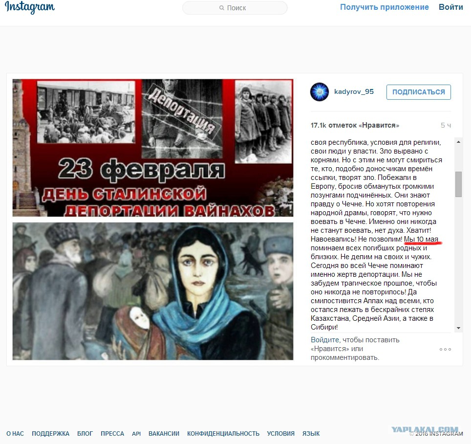 «Семьдесят два года назад Иосиф Сталин депортировал чеченский и ингушский народы. Операцией руководил Лаврентий Берия. И да будут они оба прокляты во веки веков!» – написал он.