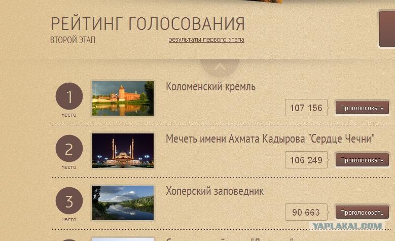 Голосую за Мамаев курган - сделать это бывает иногда очень трудно: периодически вываливает ошибку при вводе слова с капчи, то страница тупо перезагружается при нажатии на кнопку "Проголосовать". Видится мне - результаты будут толерантными - первой будет мечеть. При этом меня коробит не то, что это мечеть - была бы она в Казани или ещё где - я бы и слова против не сказал. Но только не в треклятом Грозном - чеченском Грозном