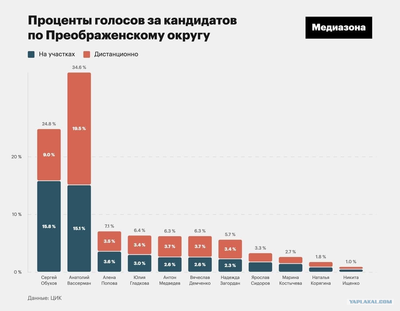 На выборах в Государственную думу на утро понедельника, 20 сентября в восьми из 15 московских округов оппозиционеры побеждали кандидатов, поддержанных мэром Сергеем Собяниным и «Единой Россией».