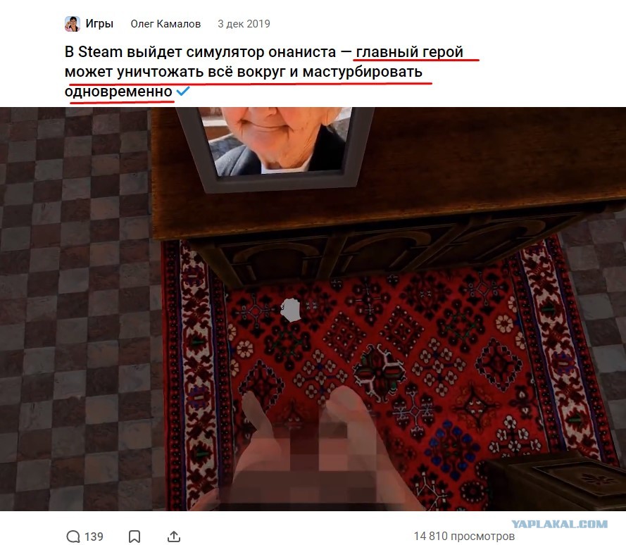 "Ultimate Games выпустила в Steam демоверсию необычной игры под названием Wanking Simulator. Ее главный герой — заядлый онанист, который мстит всему городу после того, как коррумпированная власть отобрала у него дом, где он любил «теребонькать»."