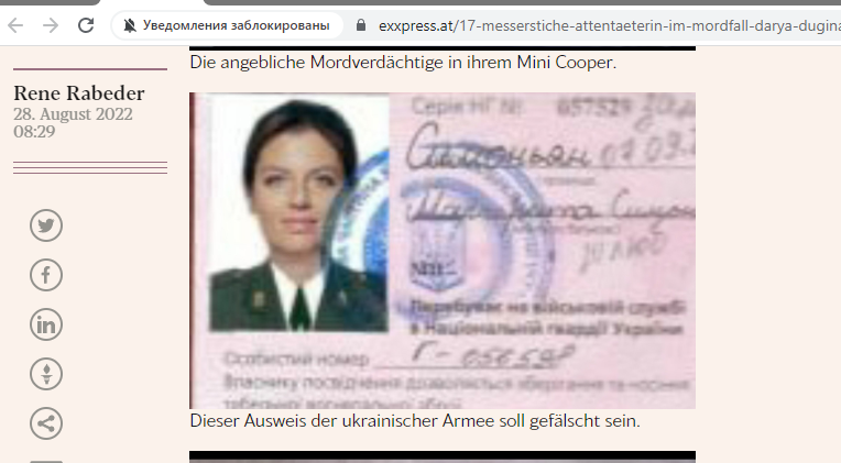 Фейк. Австрийское СМИ представило фото «зарезанной» Вовк, подорвавшей автомобиль Дугиной