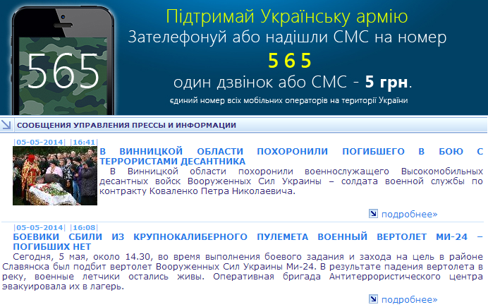Сегодня, 5 мая, около 14.30, во время выполнения боевого задания и захода на цель в районе Славянска был подбит вертолет Вооруженных Сил Украины Ми-24. В результате падения вертолета в реку, военные летчики остались живы. Оперативная бригада Антитеррористического центра эвакуировала их в лагерь.