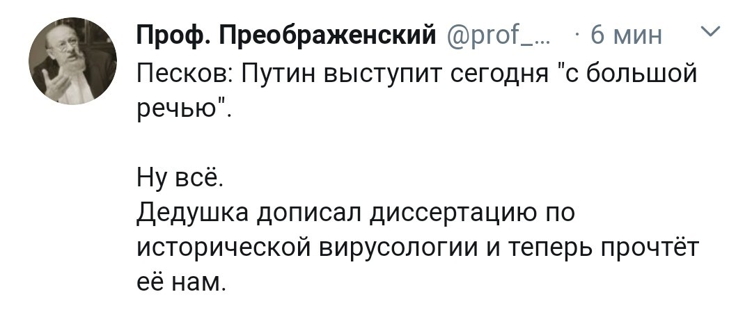 Сидит дед и начитывает по бумажке вылизанный текст. Текст про то как все важно и как все правильно надо делать. И как решительно надо противостоять вызовам с коронавирусом и печенегами.