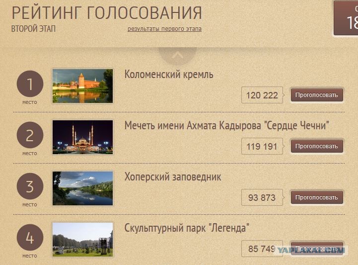 Тут один товарищ правильную вещь говорит, а его никто не слушает! У устроителей голосовалки задача одна - рубить бабло пока горячо! Как это сделать? Легко: поиграть на наших нервах и сделать так, чтобы Коломенский Кремль и чеченстрой шли ноздря в ноздрю и заставляли нас бить кулаком об стол хвататься за моб. телефоны. Хватит уже кормить этих мразей своими деньгами!