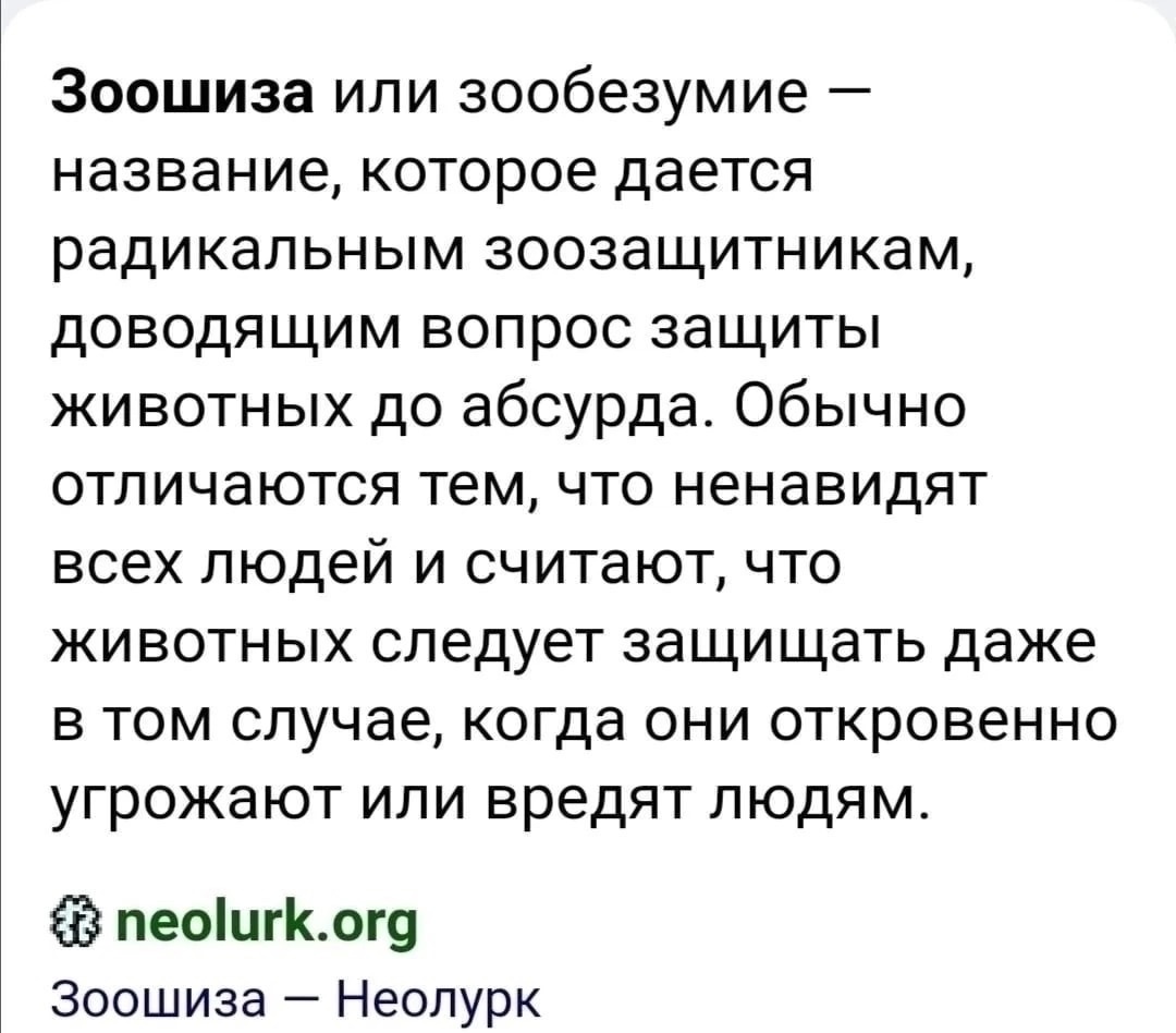 Есть зоошиза в терминальной стадии - это как раз те, кто готов за собак убивать людей. Причем за бродячих собак - нормальных людей, которые не живодеры и не маньяки (так считает зоошиза), а просто пекутся о собственной безопасности. Чудны дела твои, Господи.