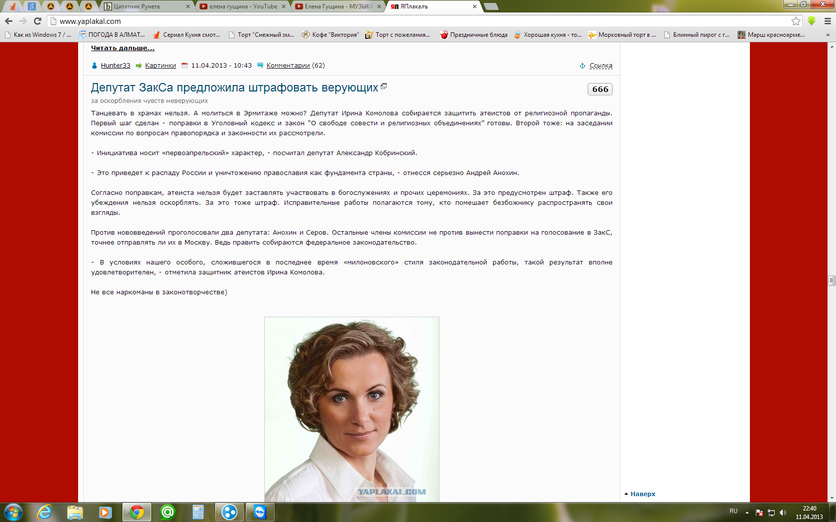 Мне она бешено понравилась.И фотка,и ее мысль.Не помню ни от одного депутата чего-то более здравого.Да,и еще-я уже предлагал-надо создасть свою секту,верующих в Ломоносова,Курчатова,Оппенгеймера и Ньютона.И пусть подаяния идут на адвокатов для атеистов.Так выживем в этом идиотизме.И за принуждения посещать сборища РПЦ(армия,школа,зона)немедленно подавать иски на бешеные суммы.
