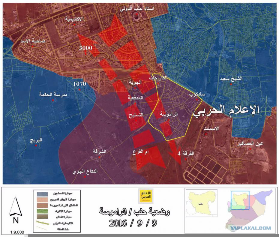 Лишенная снабжения группировка «Армия Алеппо» доживает последние дни. Одновременно с этим сирийские подразделения ведут наступление в районе Рамусе. Вместе с ними действуют палестинские боевики, имеющие огромный опыт городских боев.