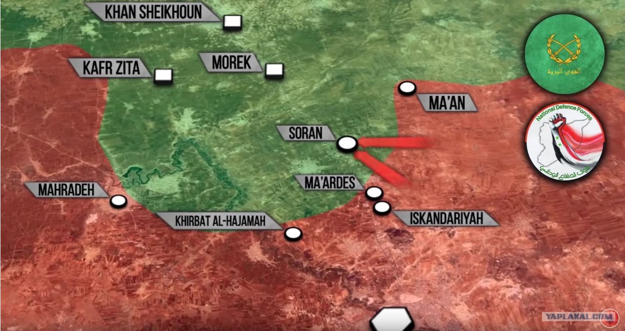 Кроме того авиация обеспечивала воздушное прикрытие сирийским подразделениям у селений Ma’ardes и Аl-Iskenderiyah, где правительственные войска пытаются продвинуться к западу.