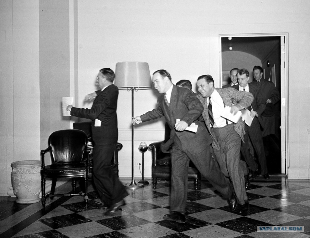 Репортеры Белого дома бегут к телефонам после того, как пресс-секретарь президента сообщим им, что японские подводные лодки и самолеты атаковали Тихоокеанский флот ВМС США в гавани Пёрл-Харбор, Гавайи, 7 декабря 1941 года. (AP Photo)