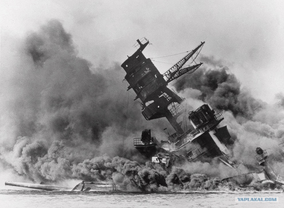 Окутанный дымом линкор «Аризона» тонет во время внезапного нападения Японии на гавань Пёрл-Харбор, Гавайи. (AP Photo)
