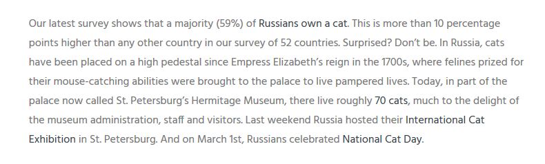 вкратце: Кошек в России любят за то, что они ловят мышек. Начали они это делать в 1700-х при Императрице Елизавете (?!). Сейчас в Эрмитаже живут около 70 кошек. Первого марта в России отмечают Национальный День Кошки (!!!!)