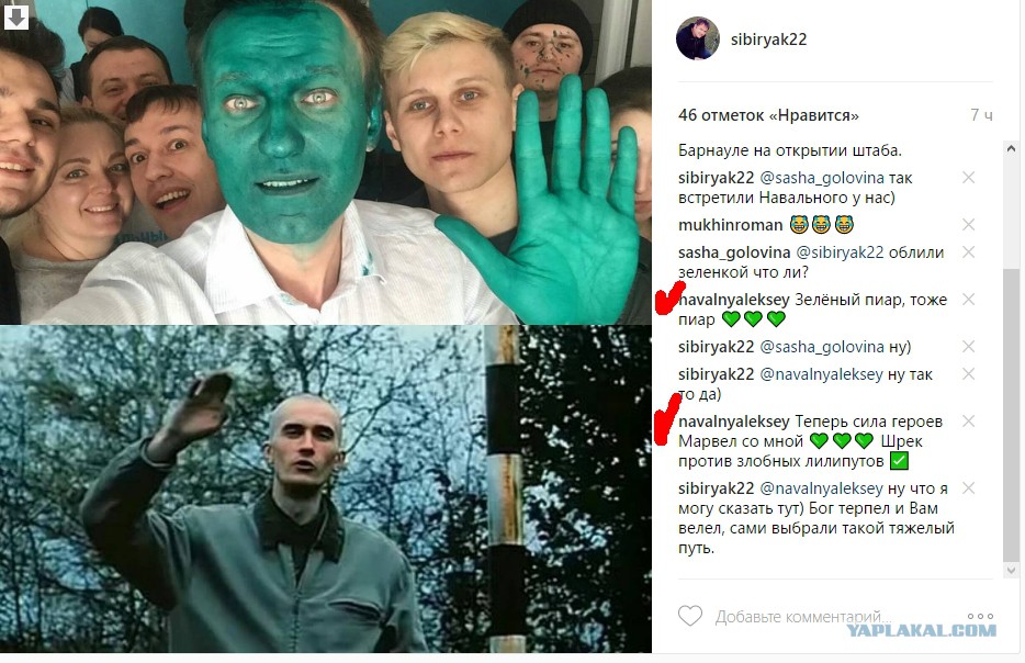 А вам не приходит в голову, что это специально делается? чтобы все подумали, какой Алексей бедненький и его дело правое, а с другой стороны выставляет тех. кто якобы против дураками и идиотами. Это всего лишь игра на два паса и Алексею выгодно, чтобы его так обливали.. А тех кто критикует его или другого мнения о нем ставит в ряд вот с этими провокаторам.. В соседней стране, которую вы упомянули, тех оппозиционеров в то время Яценюка и Кличко тоже обливали зеленкой и делали это те же свидомые, которые в итоге их к власти и привели и никакого отношения они не имеют к гражданам и патриотам своего отечества. Это обычные полит технологии, чтобы выставить себя жертвой.