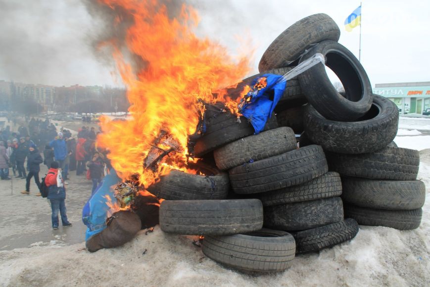 Сегодня, 22 февраля, на площади Независимости в рамках празднования Масленицы сожгли чучело врага №1 для Украины – президента РФ Владимира Путина. Чучело с лицом российского президента со свиным пятачком усадили на покрышки, обмотали георгиевской ленточкой и символикой Партии Регионов, и подожгли.