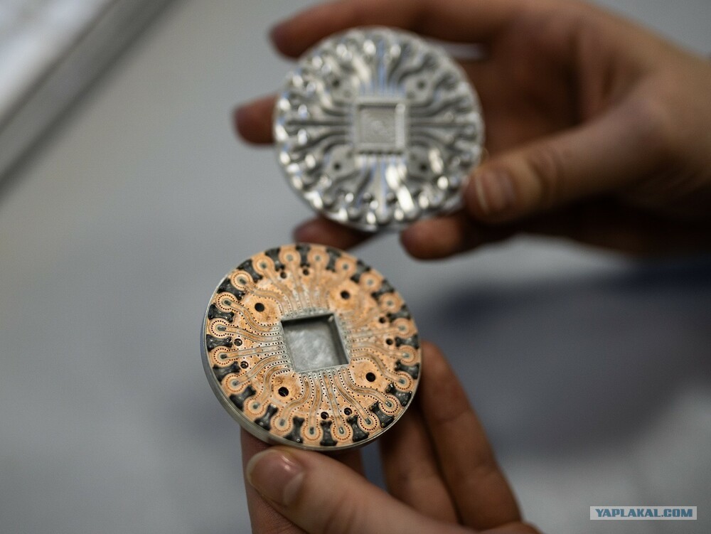 Эта микросхема устанавливается в специальный держатель и там работает, если ее охладить до сверхнизких температур - порядка десятков милликельвинов. Квантовая информация в кубитах очень чувствительна к тепловым шумам и электромагнитным помехам, поэтому температура должна быть близкой к абсолютному нулю.