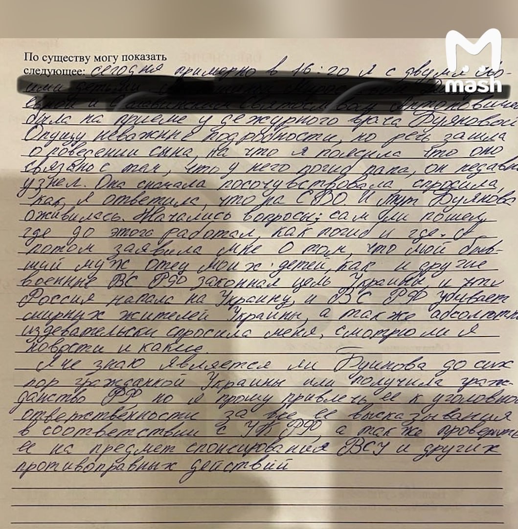 за насмешки над погибшим на СВО отцом её маленького пациента. По словам заявительницы — вдовы русского военного — врач приехала в Москву с Украины и, вероятно, поддерживает ВСУ деньгами.