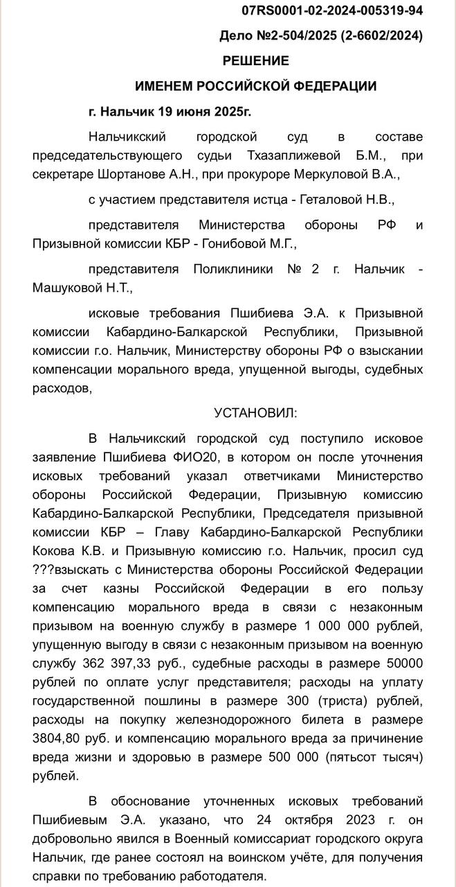Судьёй городского суда Нальчика было установлено, что призыв был проведён с нарушением медицинских критериев. Суд частично удовлетворил иск, снизив сумму до 762 тыс. руб