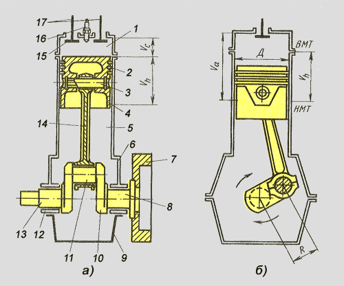 1 - головка цилиндра, 2 - кольцо, 3 - палец, 4 - поршень, 5 - цилиндр, 6 - картер, 7 - маховик, 8 - коленчатый вал, 9 - поддон, 10 - щека, 11 - шатунная шейка, 12 - коренной подшипник, 13 - коренная шейка, 14 - шатун, 15, 17- клапаны, 16 - форсунка