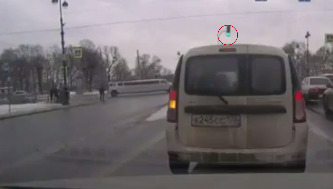 А вот, что происходит через 3 секунды. Из видео мы видели, что мудак с регистратором попёрся на зелёный.