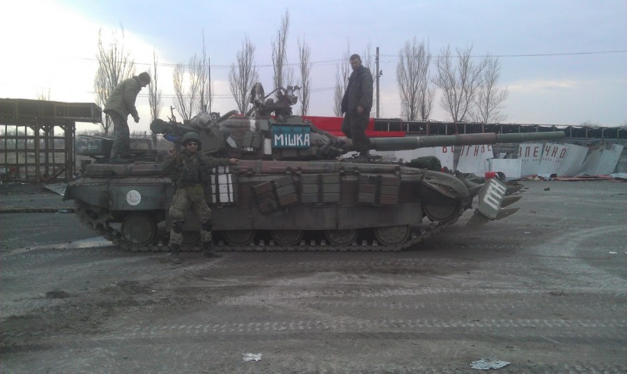 28 февраля в самом Дебальцево был захвачен еще один танк Т-64Б1В, с надписью на башенных контейнерах ДЗ и стволе орудия "Масон".
