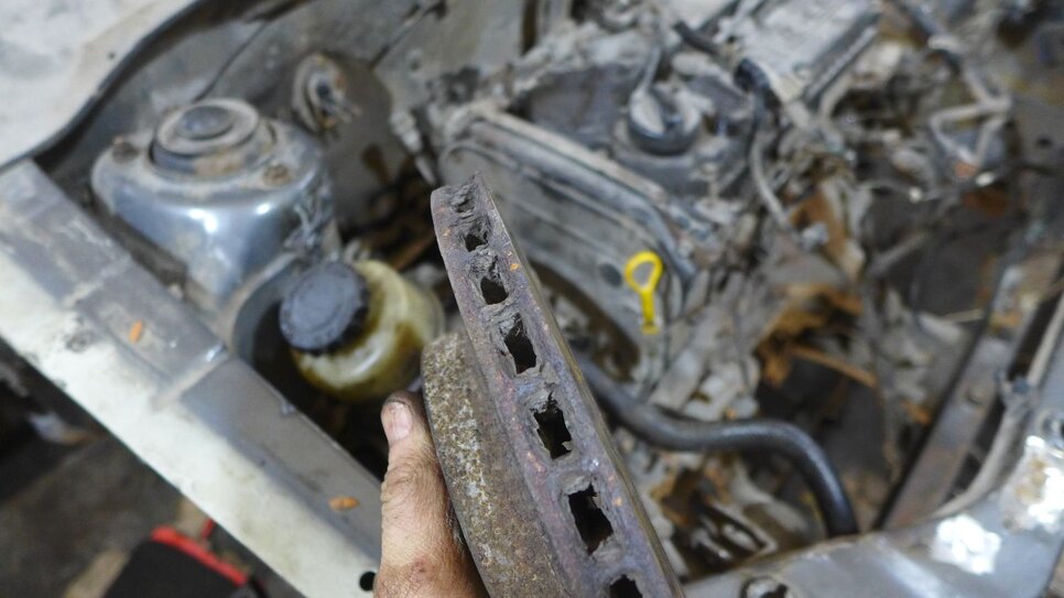 Тормозные диски изношены крайне неравномерно. Причина очевидна — заклинившие поршни тормозных цилиндров.
