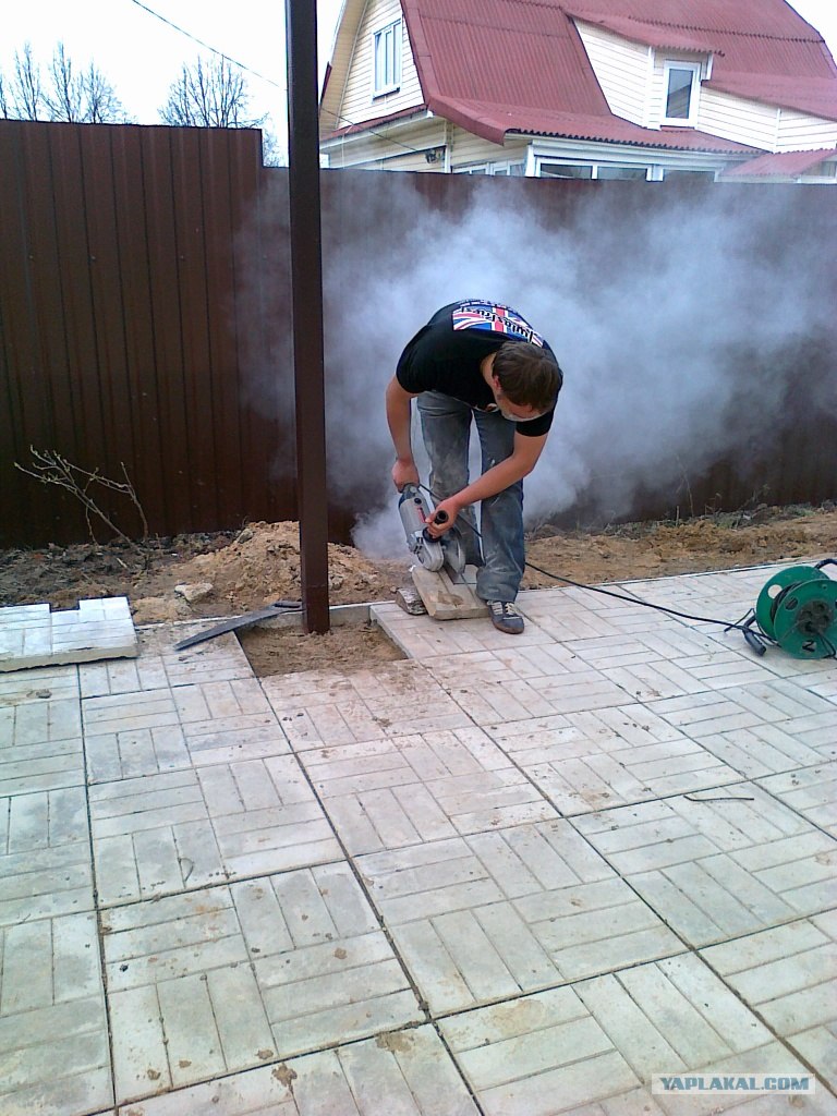 26. Данила пилит плитку для площадки. Помните я писал про то, что пришлось площадку разбирать для того, что бы заложить закладные. Плитка пострадала. Да и качество у нее не особо было. У нас ее армяне делают. И еще, знайте, что есть такой цвет: сетло- темно серая! lol.gif