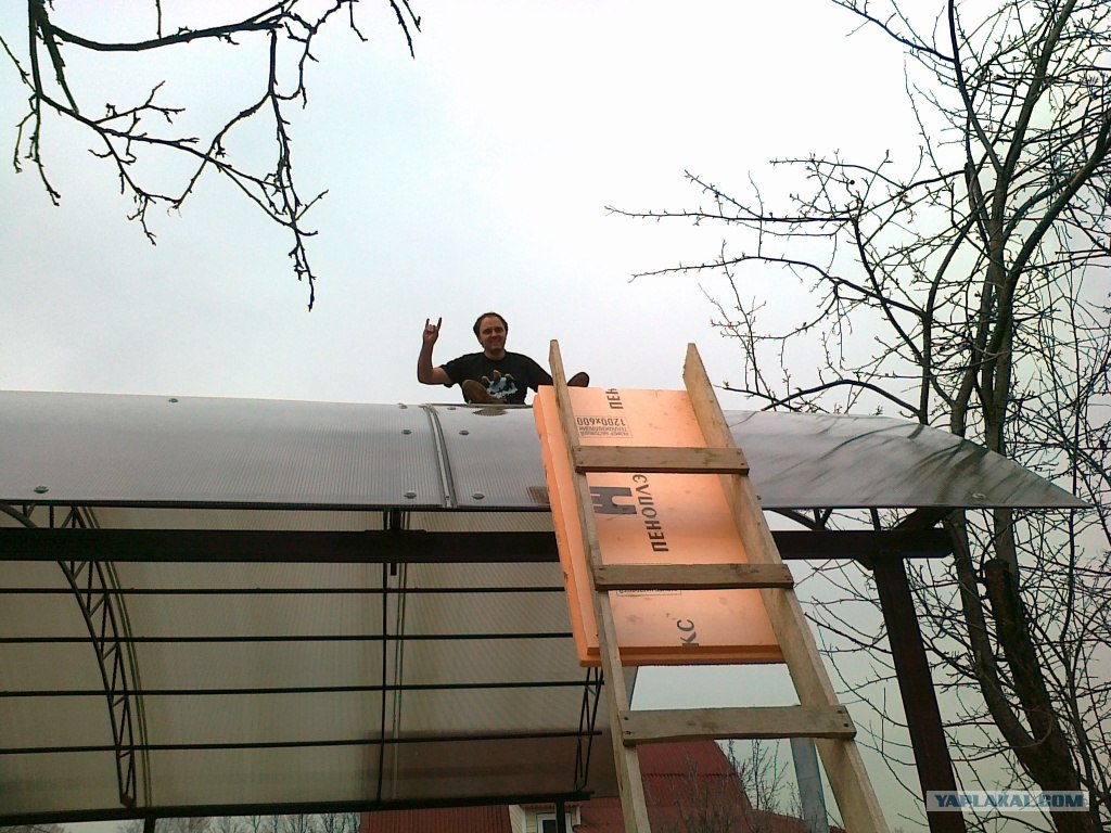 28. Крутим поликарбонат и бегаем по навесу. Тут просто устали и у нас перекур.