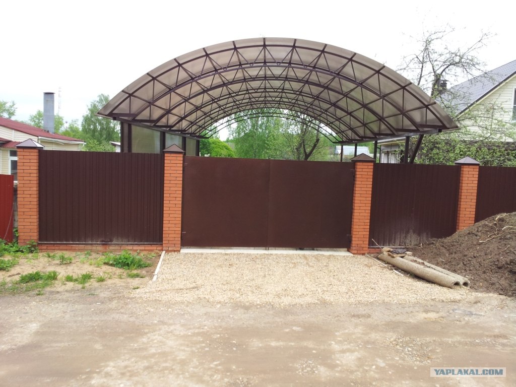 Дружище, респект! Сам собираюсь летом ставить на две машины. кирпичный не хочу, забор кованный  закроется. А вот был на выставке, увидел такие конструкции, загорелся. Скажи, на  ребра жесткости и дуги, какой квадрат идет, и поликарбонат профилем стыкуете?