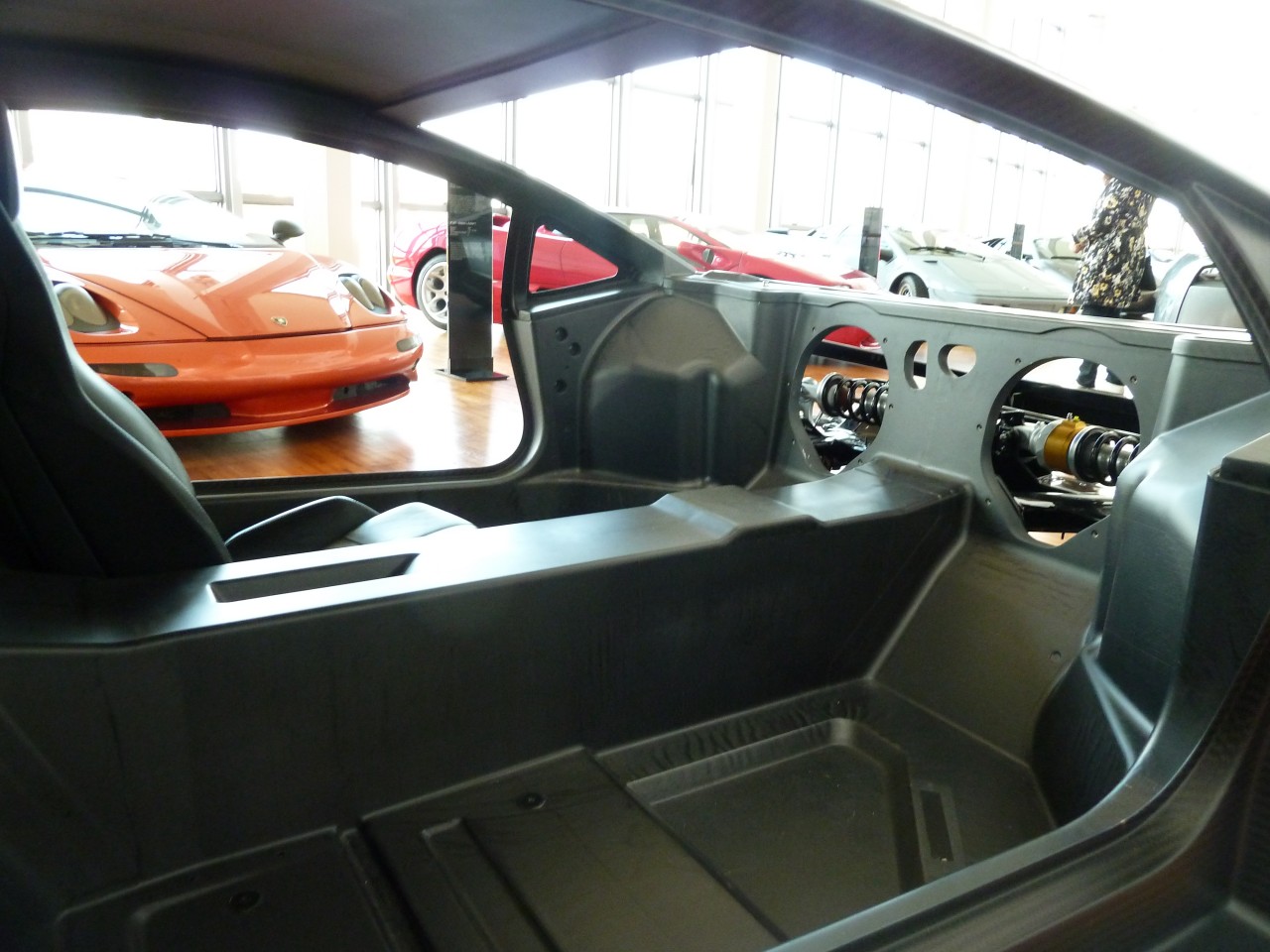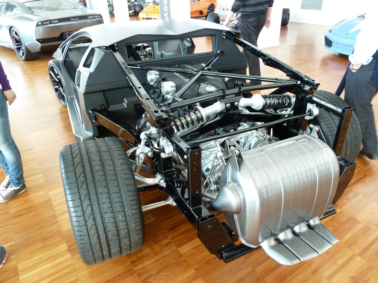 По центру зала стоит макет, представляющий технологии и компоновку суперкаров