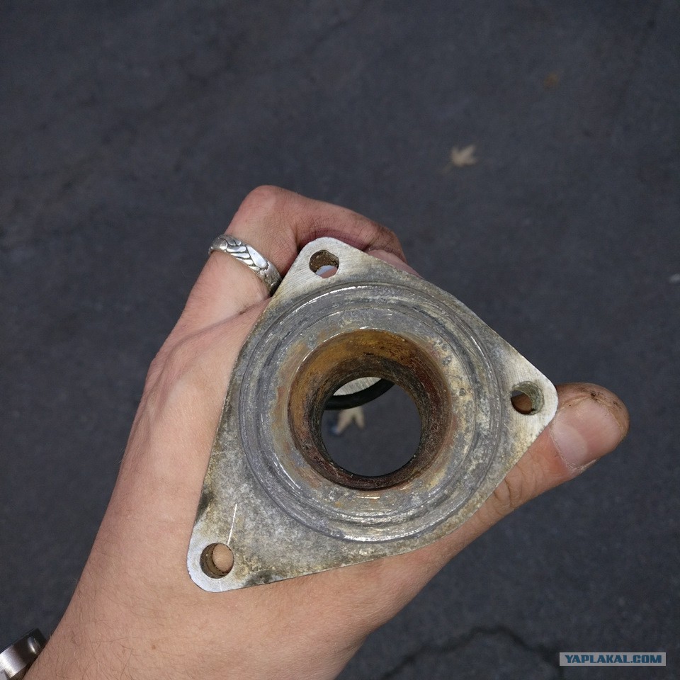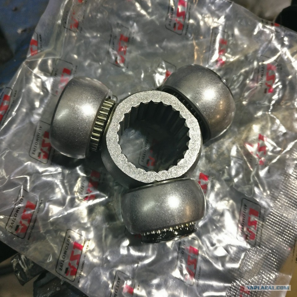 Так я впервые познакомился с тришипом. В моём случае с двухсполовинойшипом. Сама круглая часть подшипника на нём тоже осталась, а вот иглы, стопорное и ограничительное кольца, судя по всему, давно сгинули, в глубине Валиного вальгалища. Вместо масла из коробки слили чёрный гудрон.