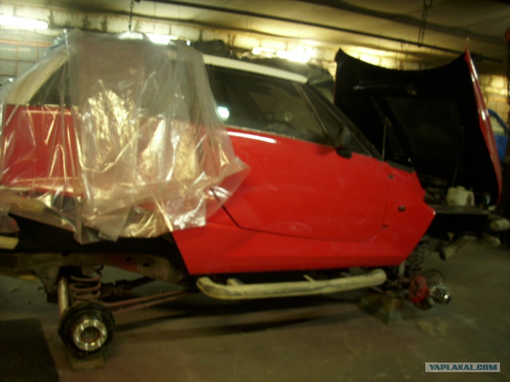 Поскольку машина интенсивно эксплуатировалась в экстремальных условиях, кузов изрядно "покоцался" и было принято решение не пытаться восстанавливать поверхность цветного пластика, а пойти по пути наименьших трудозатрат: просто зашпаклевать и покрасить в такой же красный цвет.