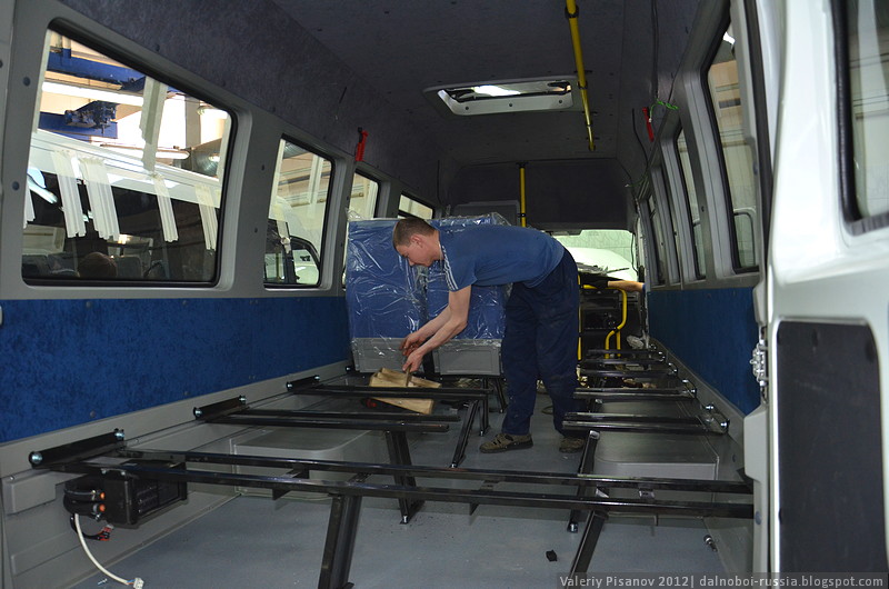 На выходе, те же автовозы, забирают новенькие маршрутки, готовые принять своих первых пассажиров.