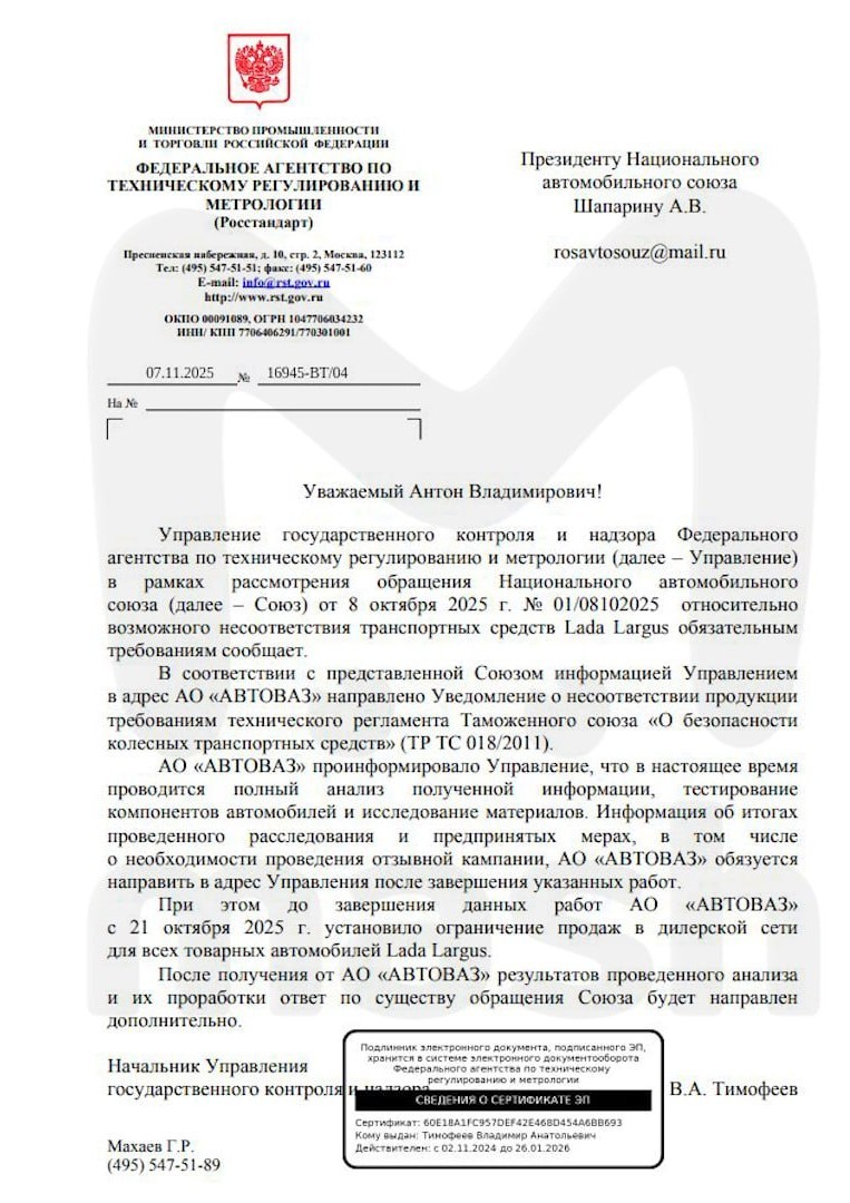 На заводе в Ижевске с 21 октября проверяют компоненты и проводят тесты — по итогам производитель обязан представить отчёт. В официальном письме от Росстандарта сказано, что до завершения работ отечественный производитель установил ограничение продаж для всех товарных автомобилей Lada Largus. Но на данный момент их не остановили.