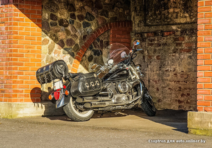Что дают в комплекте с табличкой «V-Star»? Ну, два колеса, два цилиндра суммарным объемом 1,1 литра. Котлы расположены V-образно, с углом 75°, и выдают 63 «лошадекобылы», табун которых разгоняет 272 кг (в чем япона-мать родила) до 100 км/ч за 5,2 секунды. Охлаждение мотора воздухом, привод колеса карданом. На каждый цилиндр стоит по карбюратору, зажигание электрическое, мотор заводится электростартером. Шестерен в коробке «насыпано» на пять передач, заднюю не «досыпали».