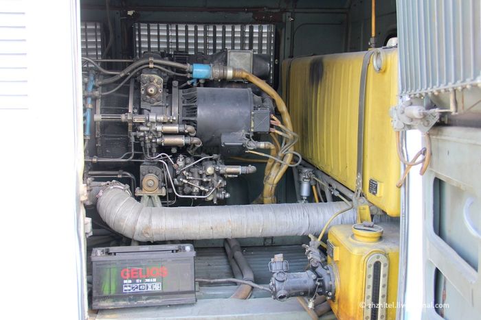Сразу за водителем установлен огромный топливный бак. За топливном баком какое-то устройство с кучей проводов, трубок и шлангов.
