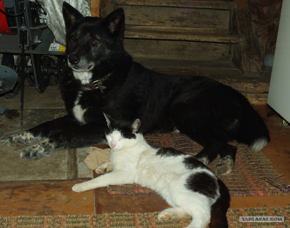 Ваську котенком муж подобрал в самолетном ангаре, отвез за город любимой теще. Кот почему-то очень немногословен, наверное, привык, что его в грохоте все равно никто не услышит))) С собакой Рексом они лучшие друзья
