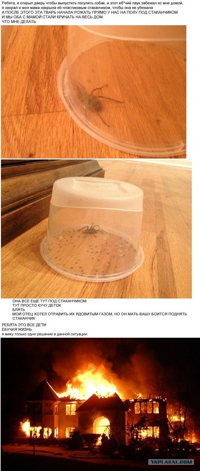 Я бы как знатный страдалец от арахнофобии выбежал бы на улицу и хрен бы вошел домой пока дом либо не спалили и не отстроили заново, либо не накрыли колпаком и чтобы они там друг друга пережорли