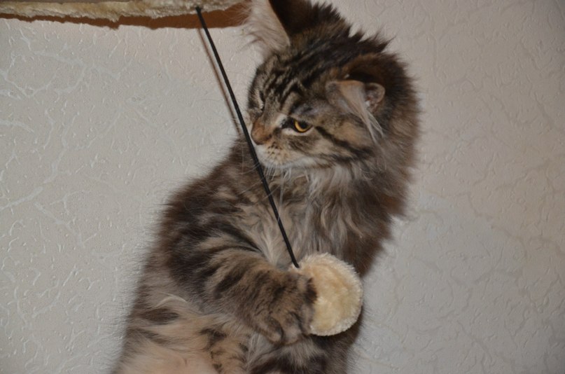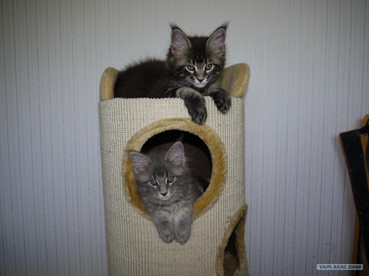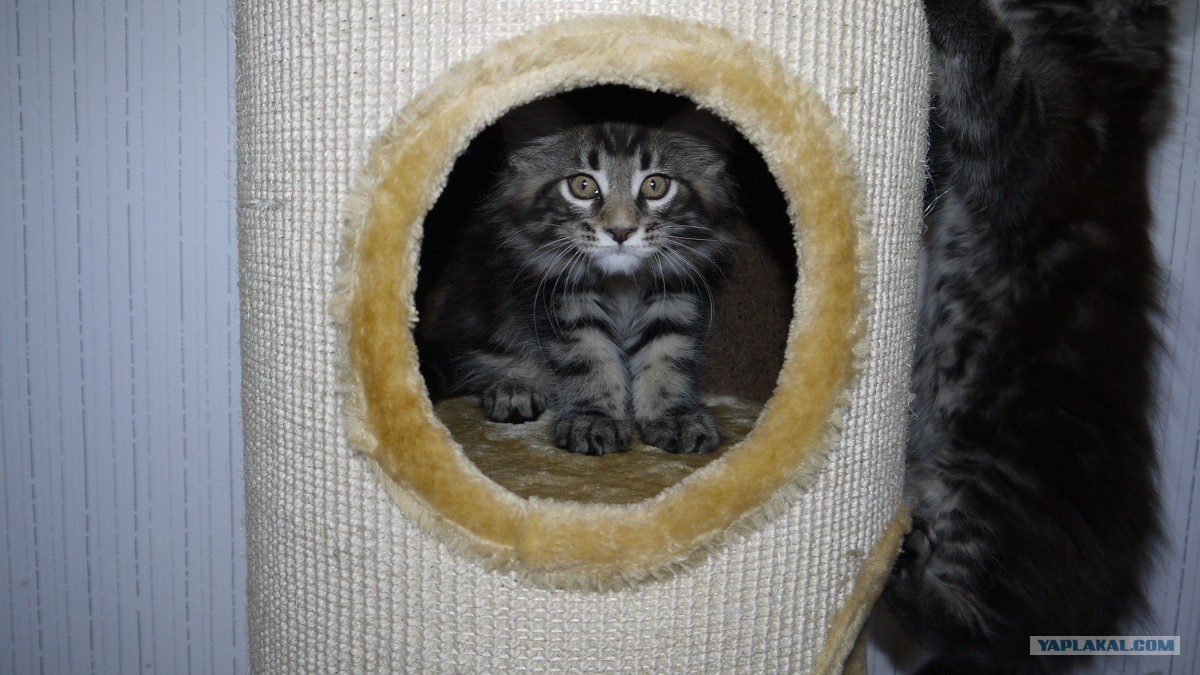 Если говорить о жизненном пространстве для мейн-кууна, то им нужны верхние этажи. Постройте им лазилки, полочки на уровне 1,2 - 1,8 м. И они с удовольствием будут обитаться там. Когтеточки - на всех углах, по возможности.