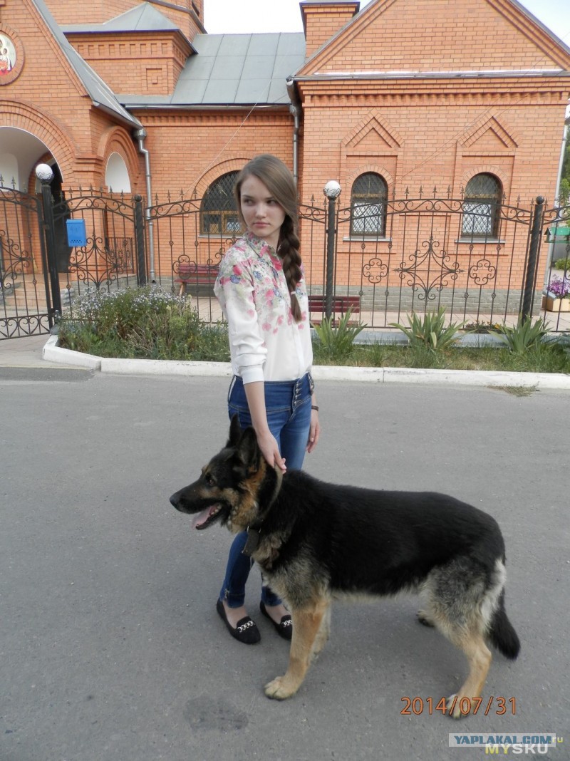 У этого немного грустная история. Не в те руки попал из питомника. Не воспитывали, били, не кормили. Нынешний хозяин кормит нормально, в остальном, пёс уже взрослый. перевоспитывать поздно. Устрашающий вид и громкий лай в наличии есть, а то, что он добродушный, ну что-ж, недостаток, но не критичный.