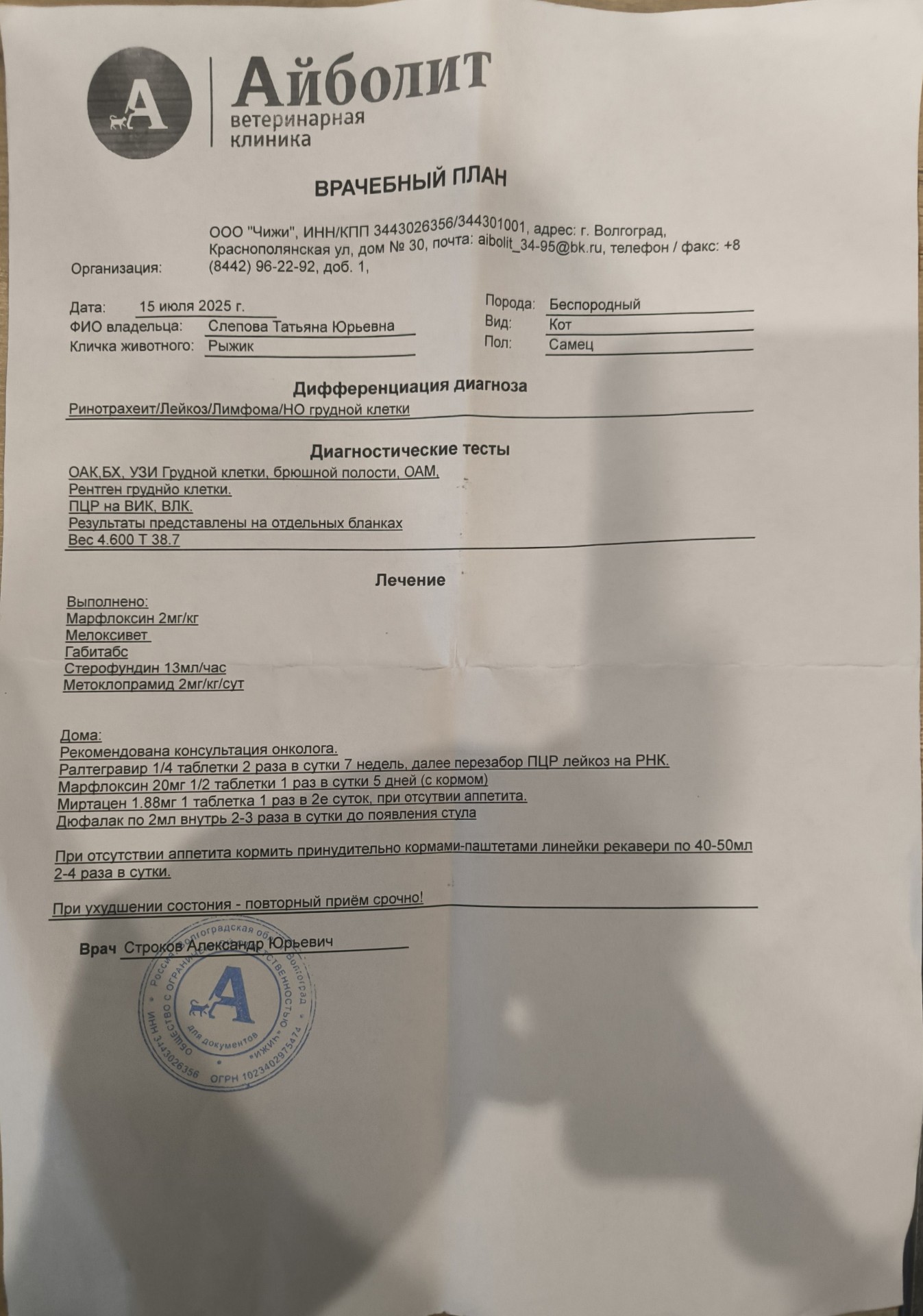 Вчера с клиники забрали Рыжего, смотреть даже жалко, весил больше 6 кг, сейчас 4,6...