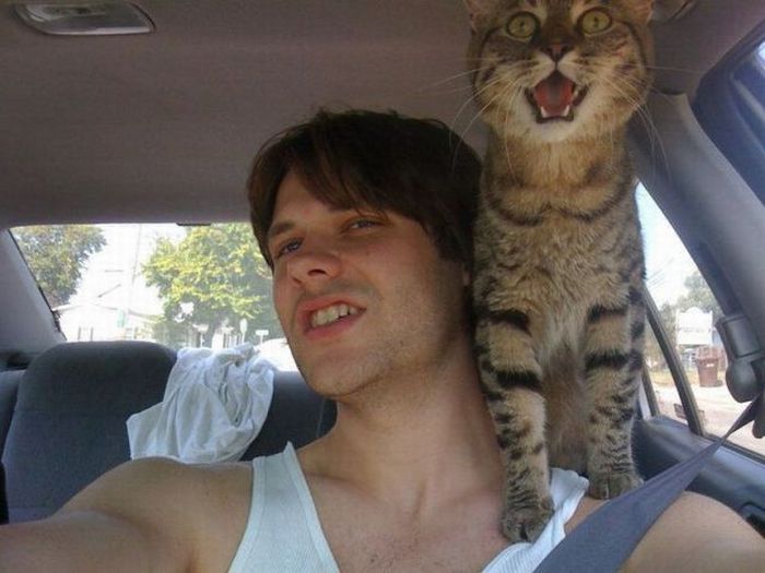 Смешно-то оно смешно, да опасно. И кошка, и собака у нас переезжают в машине только в специальной клетке-чемодане.