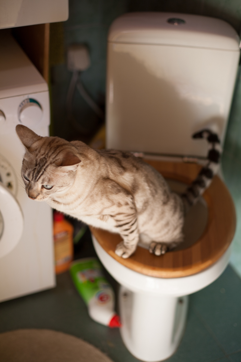 Но самое интересное было потом. Поскольку этот кот все таки умнее сородичей, от унитаза он не отказался. Подумаешь, крышка! Он подошел к делу как настоящий мужик, с логикой. Теперь он гадит в унитаз строго перпендикулярно мордой в крышку, чтобы заранее видеть приближающуюся опасность. Так же замирает в неподвижной позе, так же стекленеет взгляд, но теперь все лишнее падает перед унитазом. Зато кот в безопасности.
