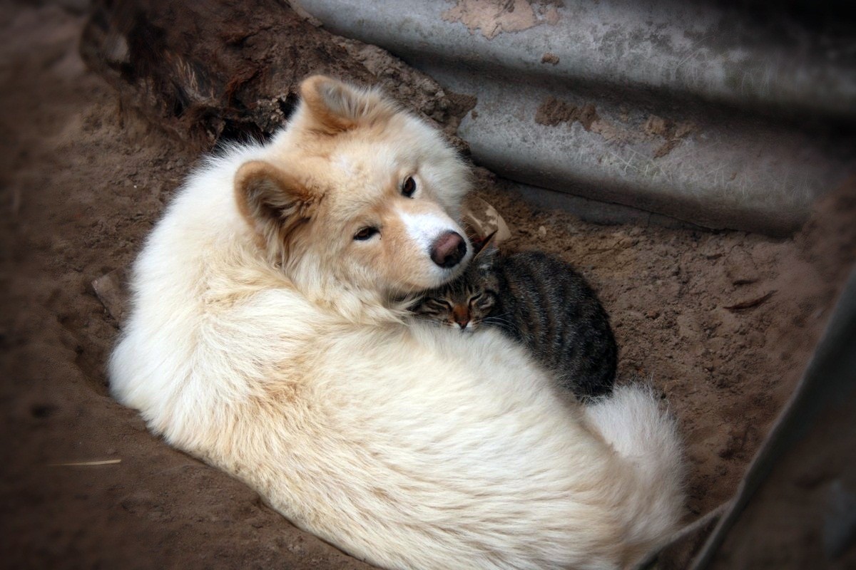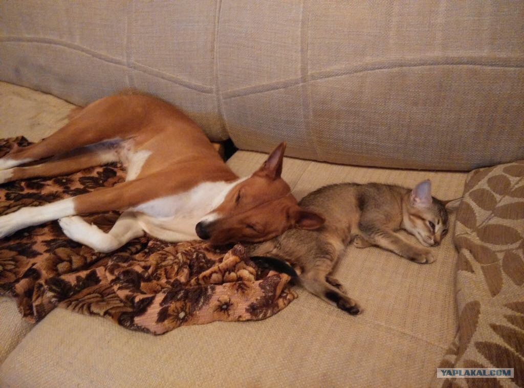 Кошаки есть кошаки, хотят собак вместо подушки используют, хотят - хозяев... Наша псина(русский спаниель) явно не в восторге от такого применения, морда такая несчастная становится, когда коша осчастливливает её вниманием. Однако не рычит, а молча терпит...