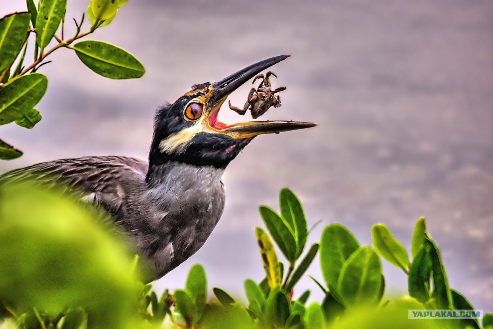 71.Цапля поймала змею. Змея обвилась кольцами вокруг клюва цапли и не позволила птице раскрыть его. Боритесь до последнего!