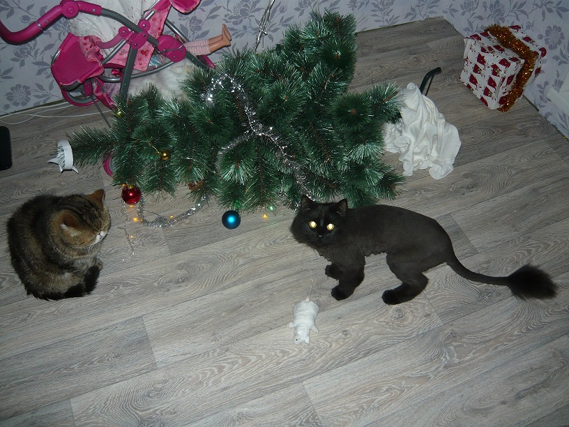О, у меня шерстяной пидарас ёлку несколько раз валил. Стал её привязывать.
