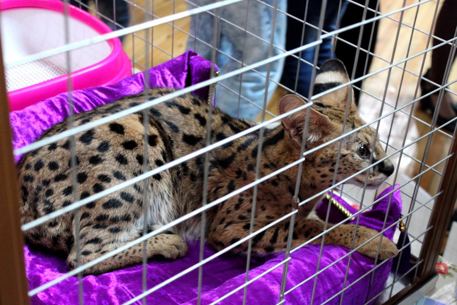 8. Динь-Динь – полтора года, она еще маленькая, и продолжает расти. Дикая кошка, вопреки всем стереотипам, очень ласкова, и, как истинная девушка, стеснительна и кокетлива. Хозяйка приобрела животное в целях скрещивания с домашней кошкой и выведения новой породы «Саванна».