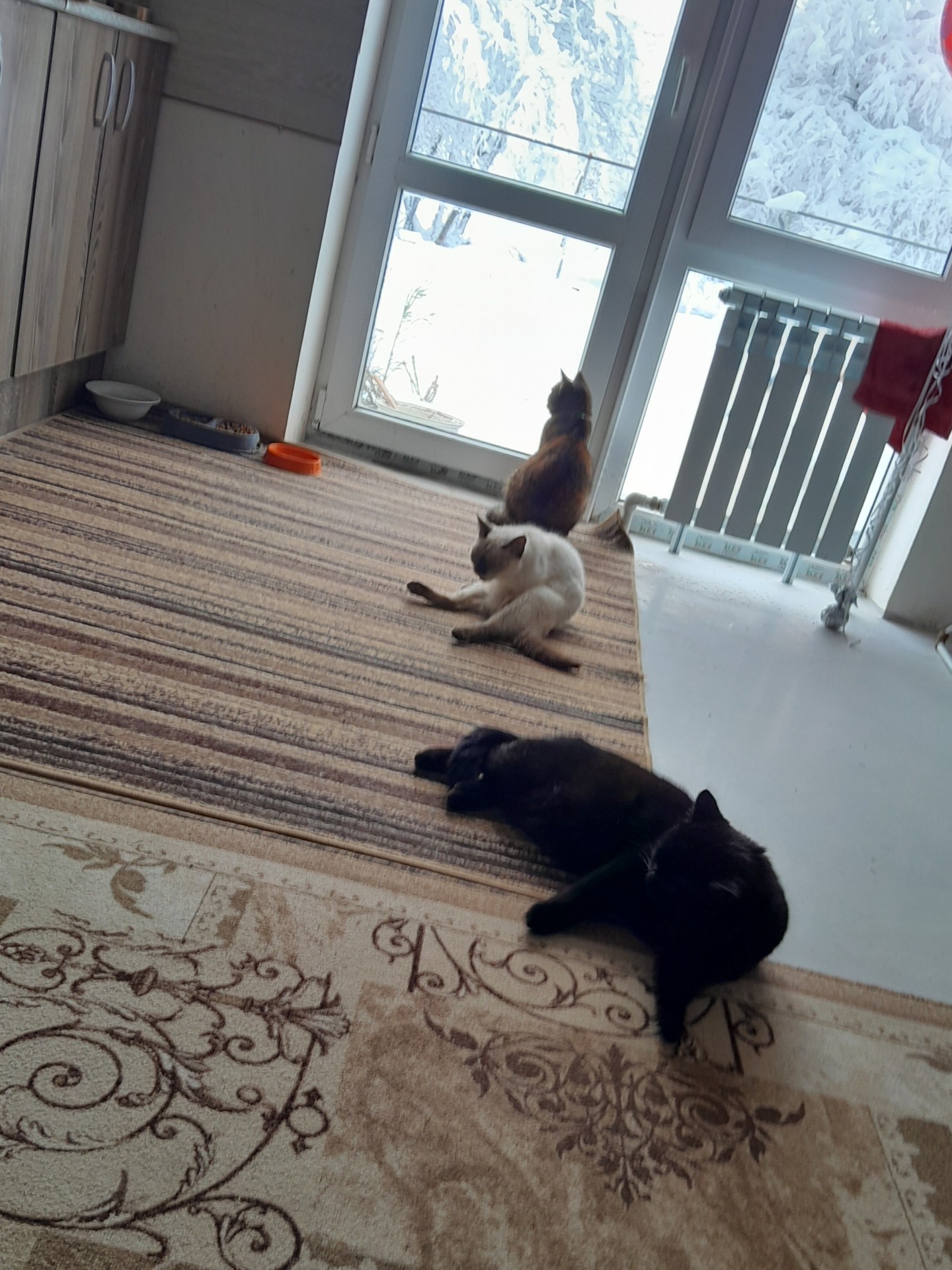 Пришёл котёнок к соседке. У неё уже взрослые кот и кошка.